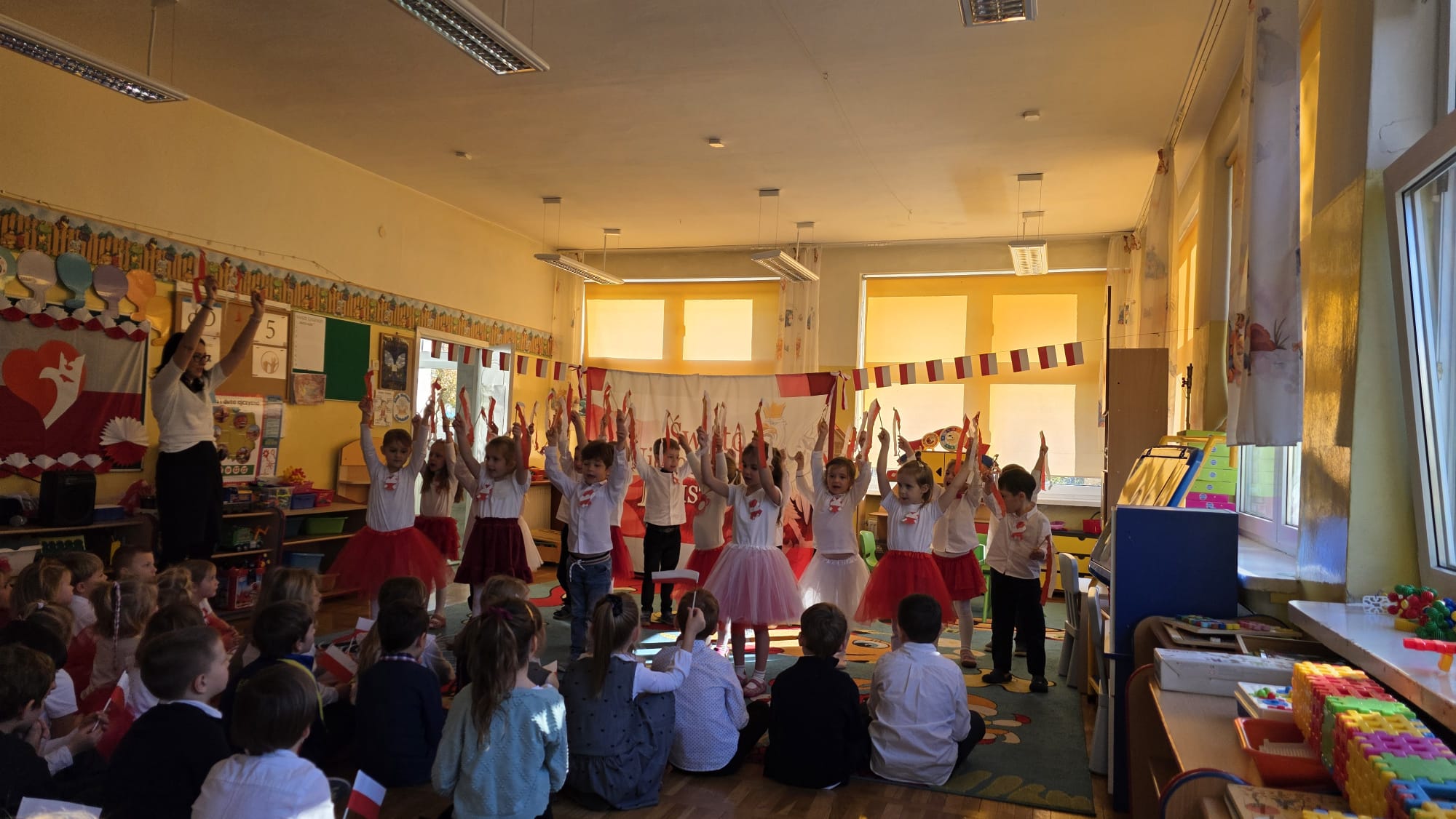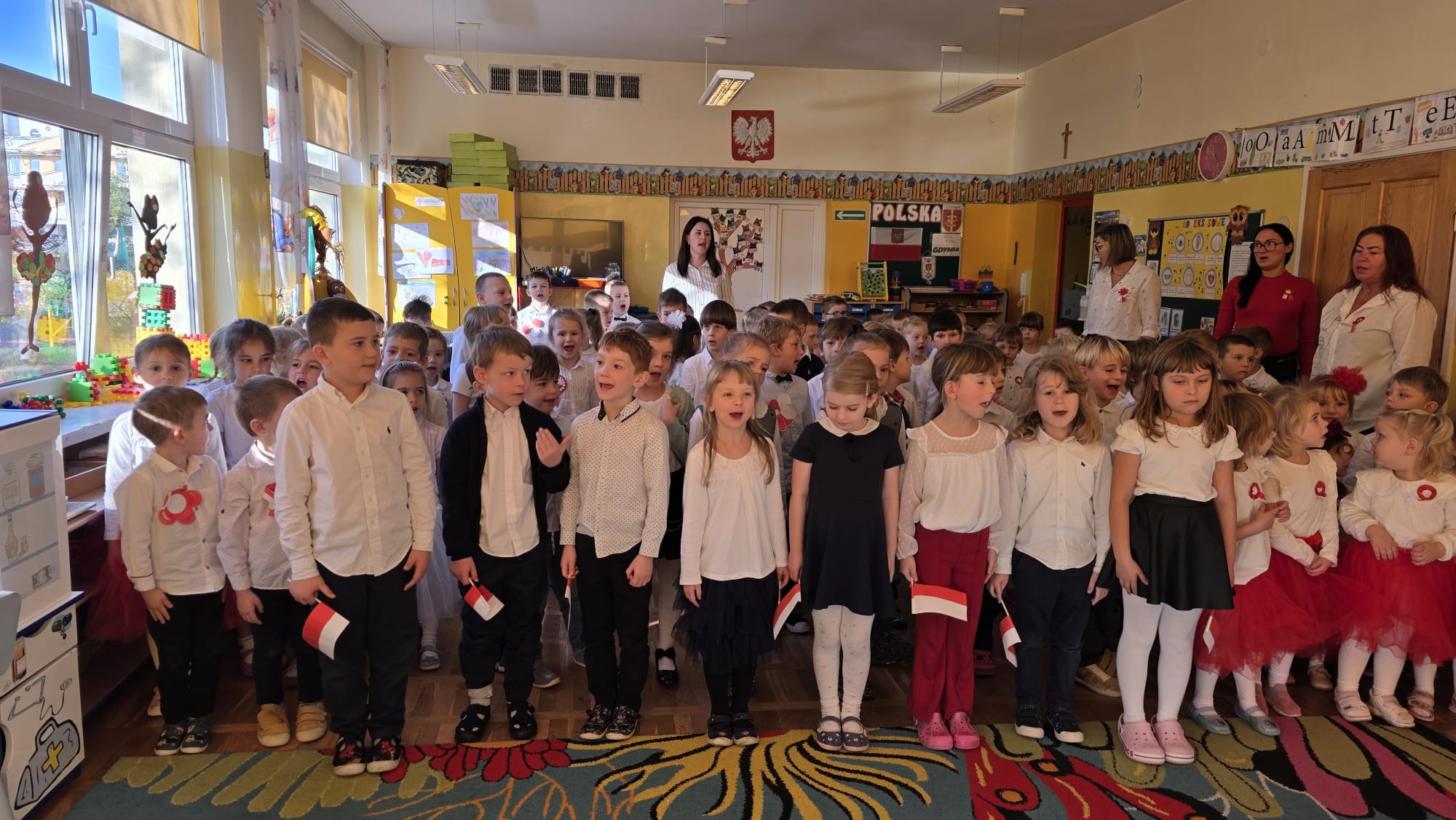 NA KONIEC O GODZ. 11:11 CAŁA SPOŁECZNOŚC PRZEDSZKOLNA UROCZYŚCIE ODŚPIEWAŁA HYMN NARODOWY.