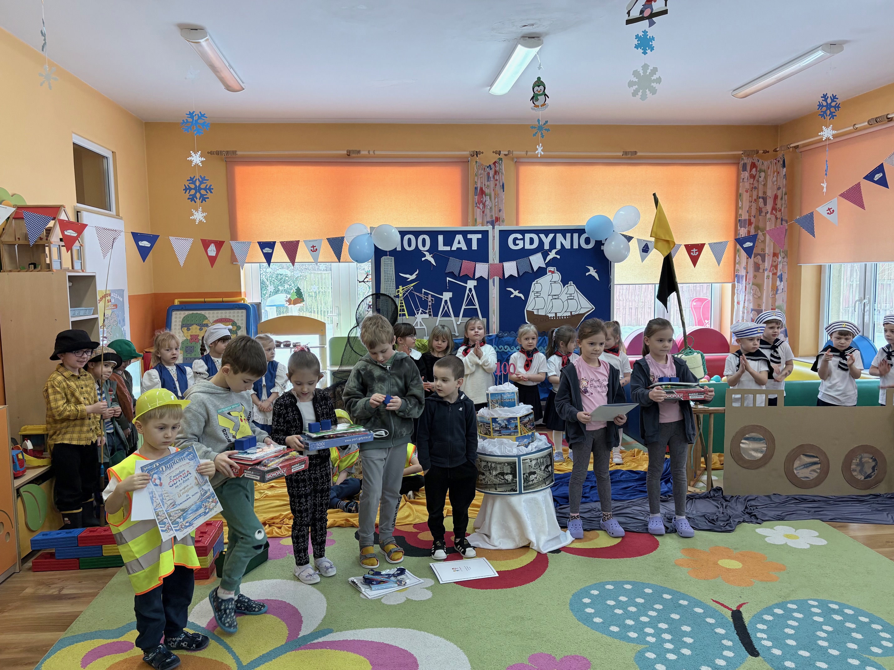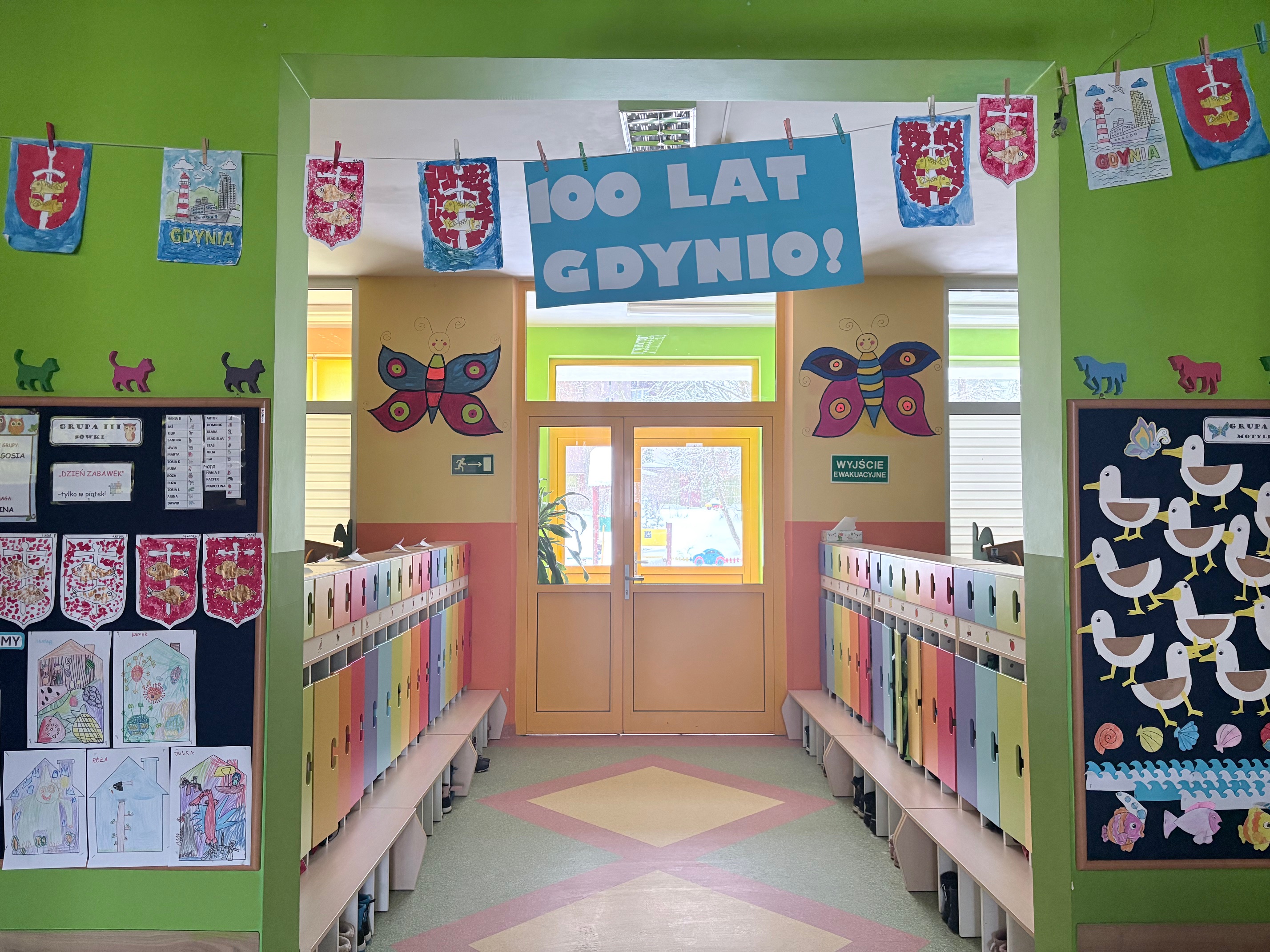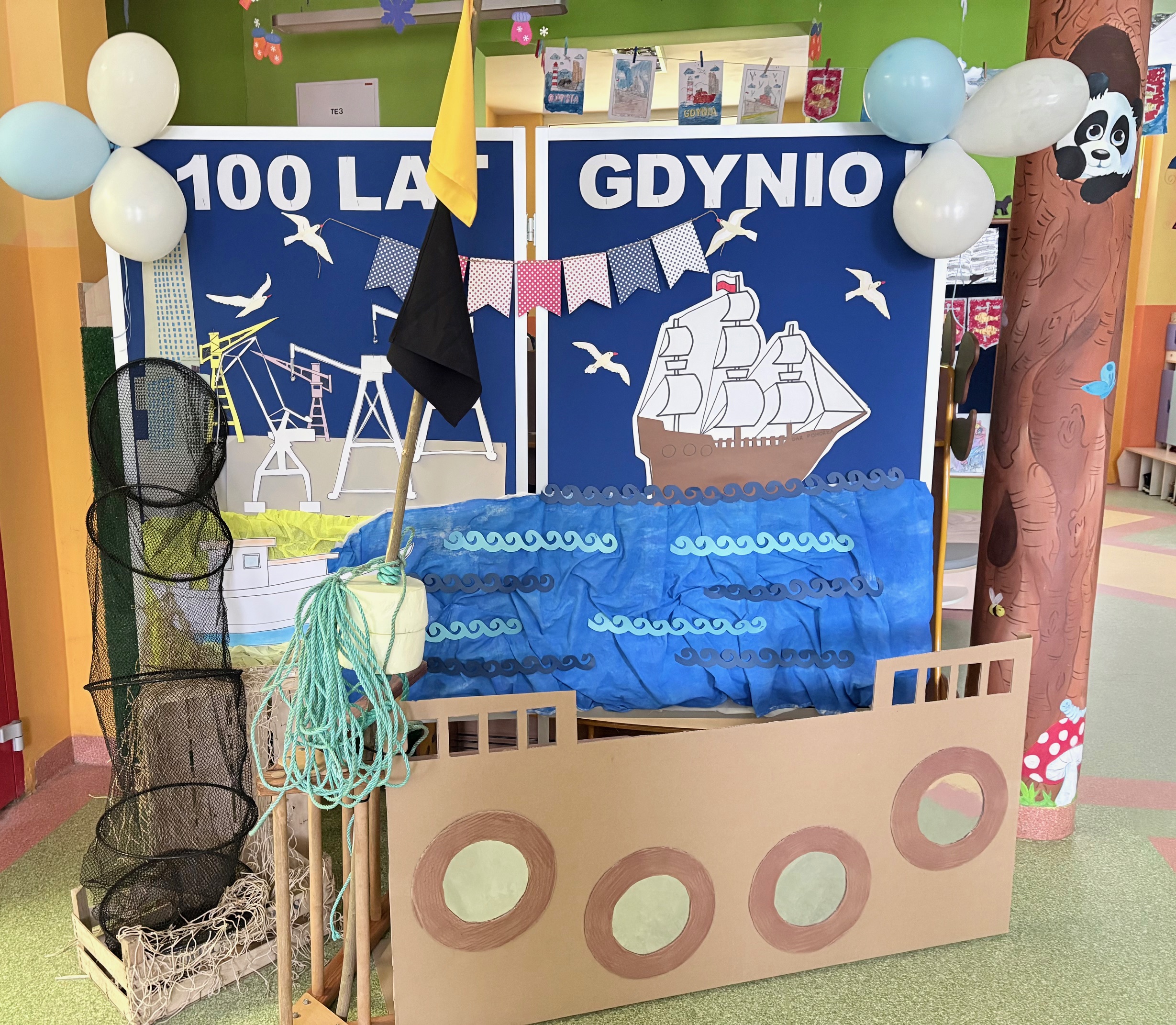 W HOLU PRZEDSZKOLA JEST PIĘKNA DEKORACJA, KTÓRA BĘDZIE NAM TOWARZYSZYĆ JESZCZE PRZEZ CHWILĘ, MOŻEMY TAM ZOBACZYĆ FLAGĘ NASZEGO MIASTA, PRAWDZIWE SIECI RYBACKIE, ELEMENTY Z PRAWDZIWEGO KUTRA RYBACKIEGO, PRACE DZIECI Z GRUPY VI "MOTYLKI"-PLAKAT NA 100 URODZINY, MAKIETĘ MIASTA GDYNI-WYKONANĄ PRZEZ DZIECI Z GRUPY III "SÓWKI", TORT URODZINOWY , KTÓRY PRZY POMOCY PAŃ WYKONAŁY MALUSZKI Z GRUPY I "KOTKI", W GRUPIE II "KWIATUSZKÓW" ZNAJDUJE SIĘ PIĘKNA WYSTAWA ZDJĘĆ I KARTEK "GDYNIA DAWNIEJ I DZIŚ" ORAZ FOTORAMKA Z MOTYWEM GDYNI, PRZY KTÓREJ DZIECI MOGĄ ZROBIĆ SOBIE ZDJĘCIE.