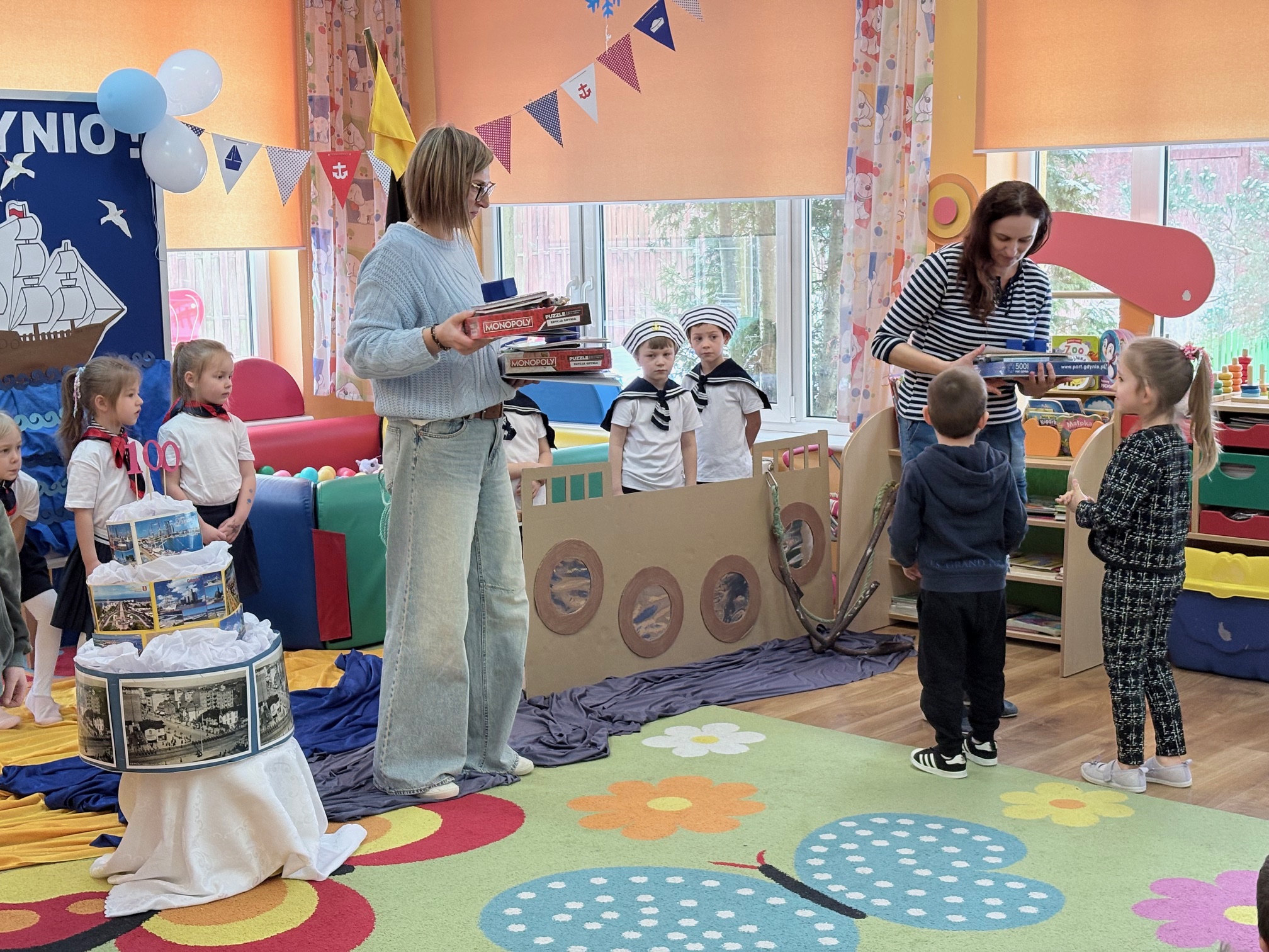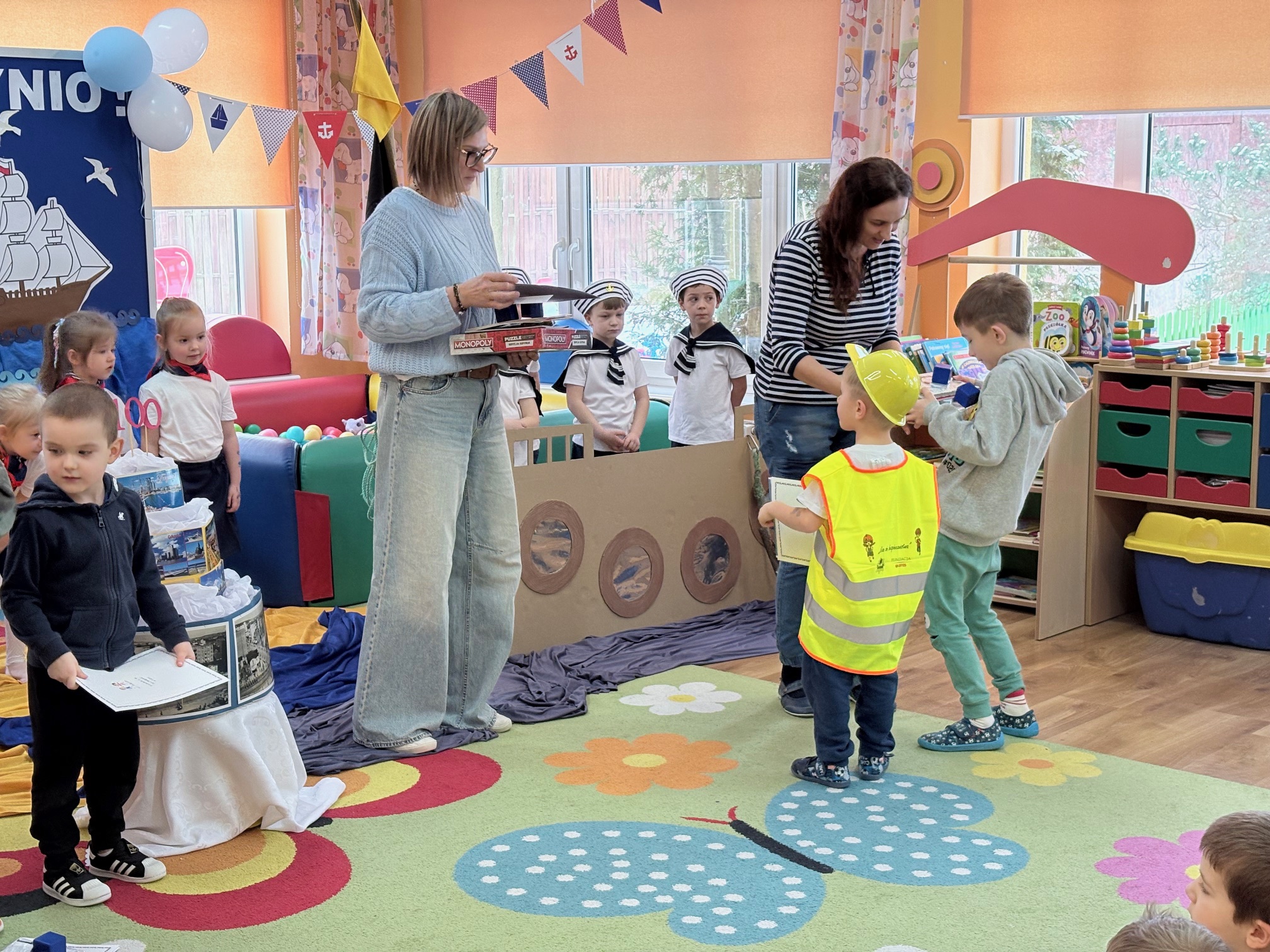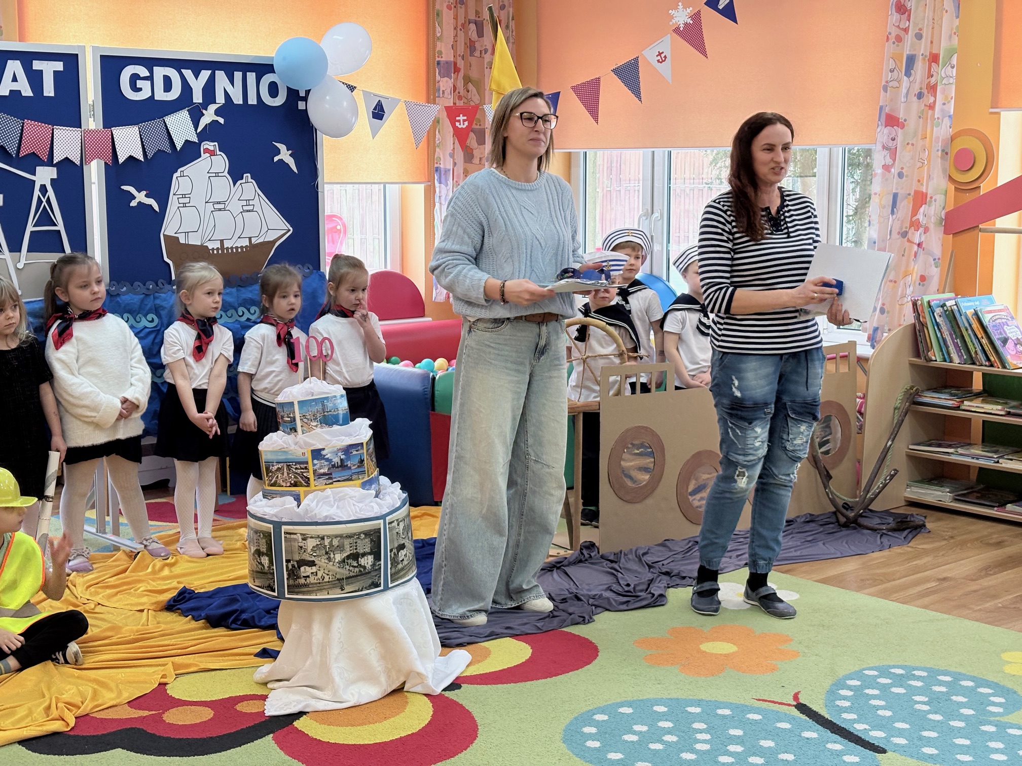 W HOLU PRZEDSZKOLA JEST PIĘKNA DEKORACJA, KTÓRA BĘDZIE NAM TOWARZYSZYĆ JESZCZE PRZEZ CHWILĘ, MOŻEMY TAM ZOBACZYĆ FLAGĘ NASZEGO MIASTA, PRAWDZIWE SIECI RYBACKIE, ELEMENTY Z PRAWDZIWEGO KUTRA RYBACKIEGO, PRACE DZIECI Z GRUPY VI "MOTYLKI"-PLAKAT NA 100 URODZINY, MAKIETĘ MIASTA GDYNI-WYKONANĄ PRZEZ DZIECI Z GRUPY III "SÓWKI", TORT URODZINOWY , KTÓRY PRZY POMOCY PAŃ WYKONAŁY MALUSZKI Z GRUPY I "KOTKI", W GRUPIE II "KWIATUSZKÓW" ZNAJDUJE SIĘ PIĘKNA WYSTAWA ZDJĘĆ I KARTEK "GDYNIA DAWNIEJ I DZIŚ" ORAZ FOTORAMKA Z MOTYWEM GDYNI, PRZY KTÓREJ DZIECI MOGĄ ZROBIĆ SOBIE ZDJĘCIE.