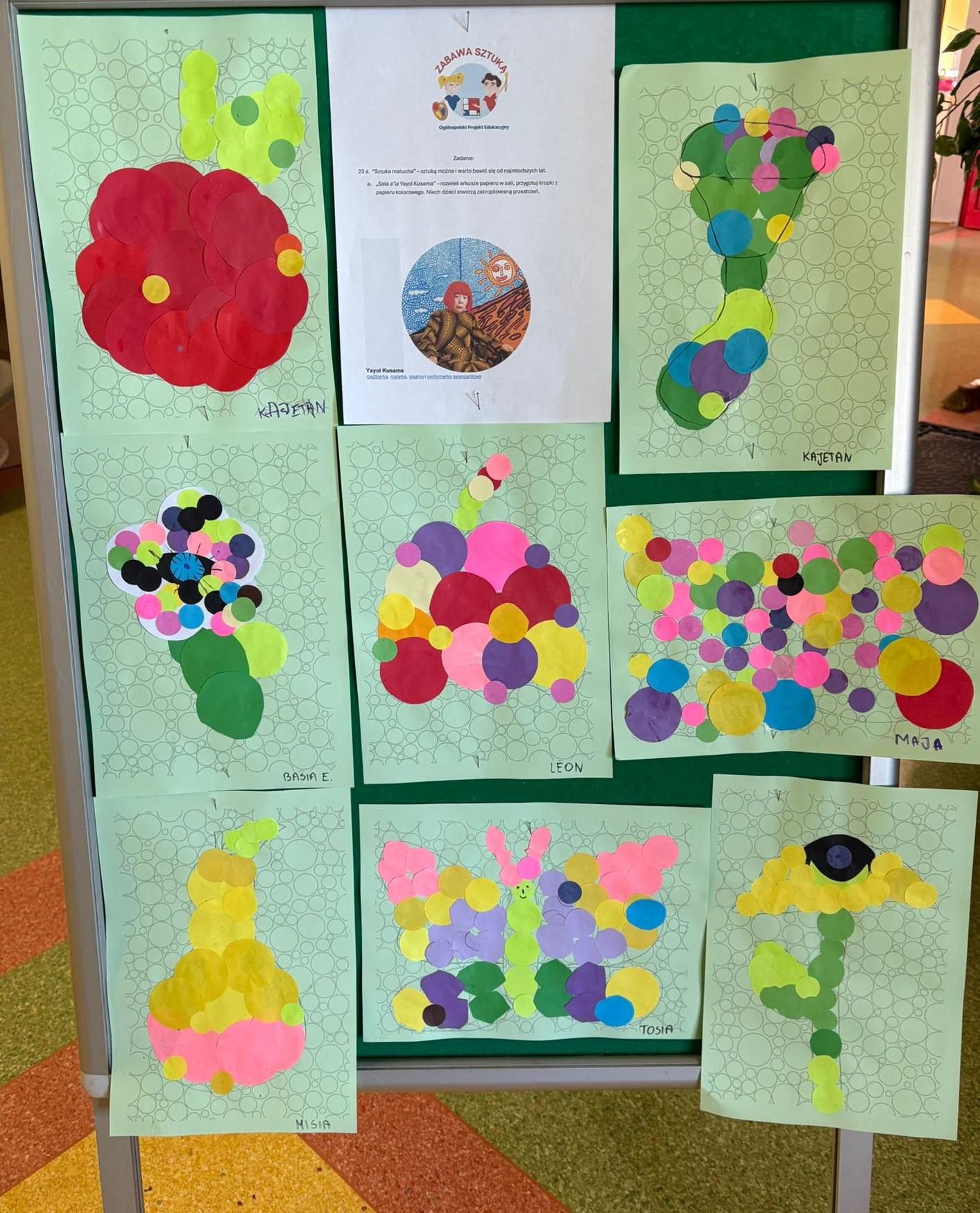 DZIECI Z GRUPY VI MOTYLKÓW W RAMACH PIERWSZEGO ZADANIA W "DNIU KROPKI" WYKONAŁY SAMODZIELNIE PRACĘ, NAWIAZUJĄCE DO TWÓRCZOŚCI ARTYSTKI YAYOI KUSAMY, KTÓREJ OBSESJĄ SA KROPKI.